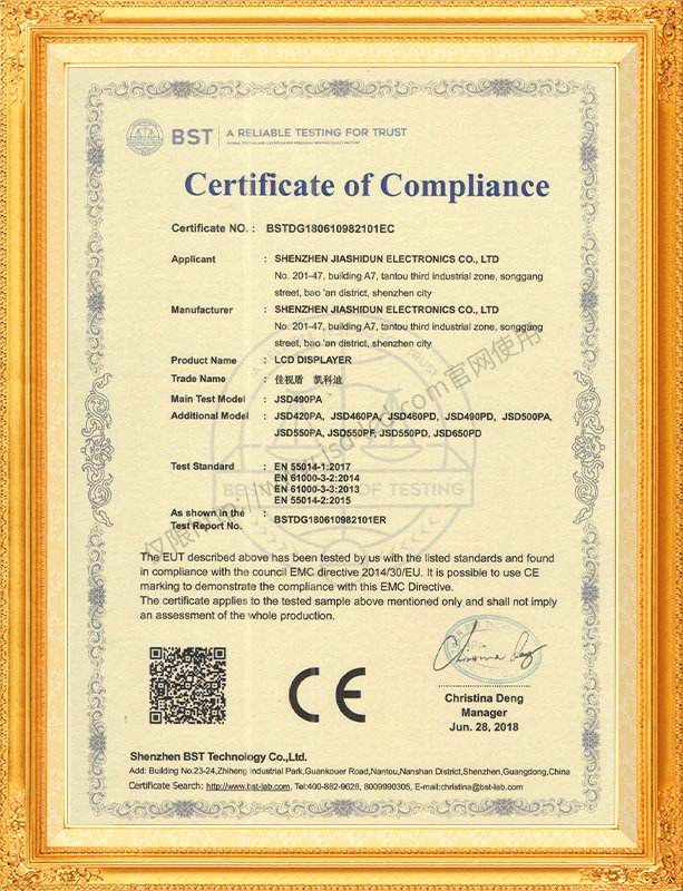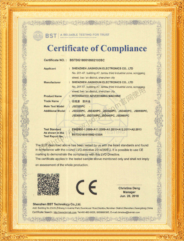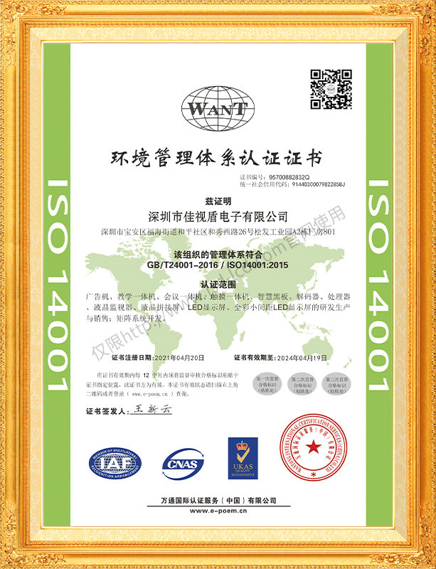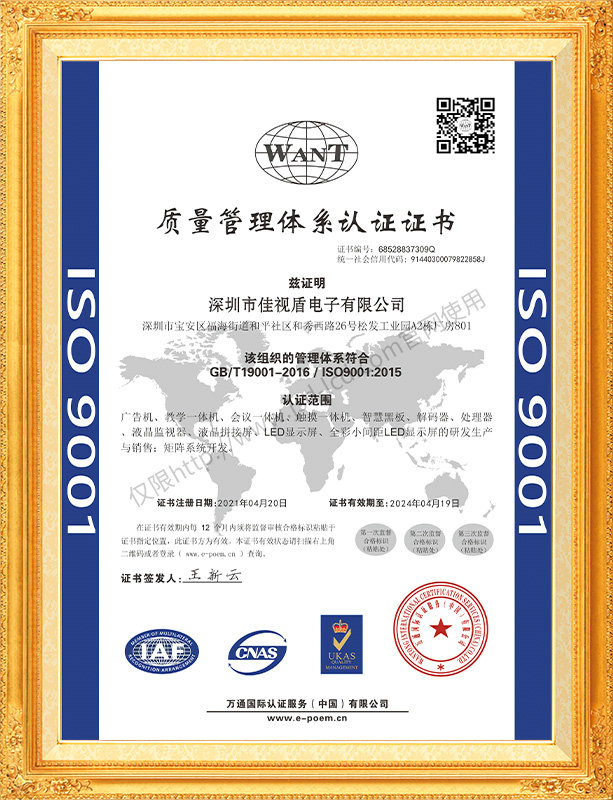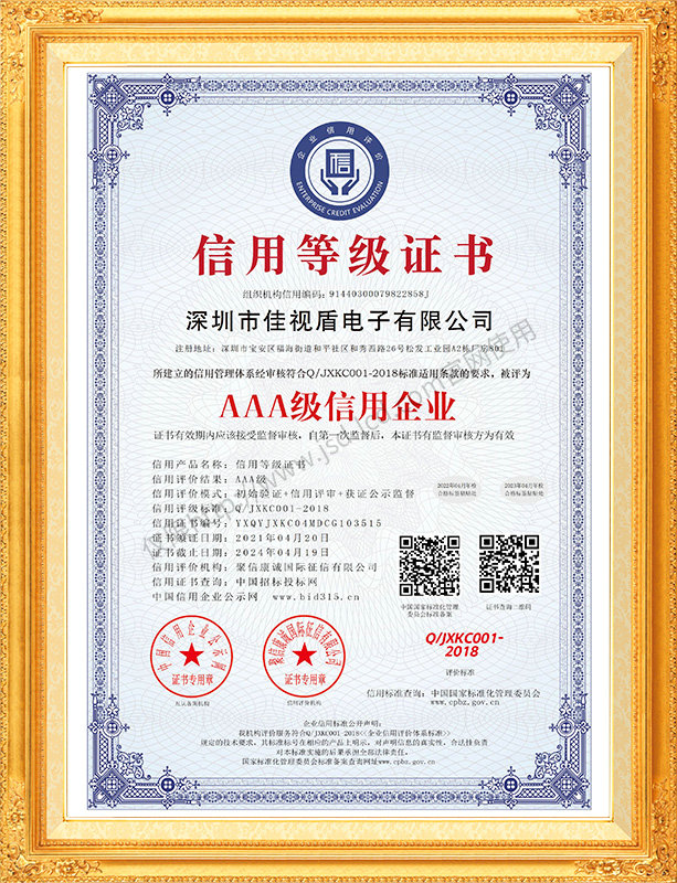 佳視盾科技采用了科學現代化管理模式,公司和產品通過了CCC、CB、CE、FCC、ROHS、ISO9001、職業健康管理體系、環境管理體系,中國節能認證、多項認證,取得多項專利技術及多項軟件著作權, 并獲得國家及行業協會的多項榮譽證書,所有產品均經過嚴格老化檢測及測試,達到行業優等品的出貨標準。